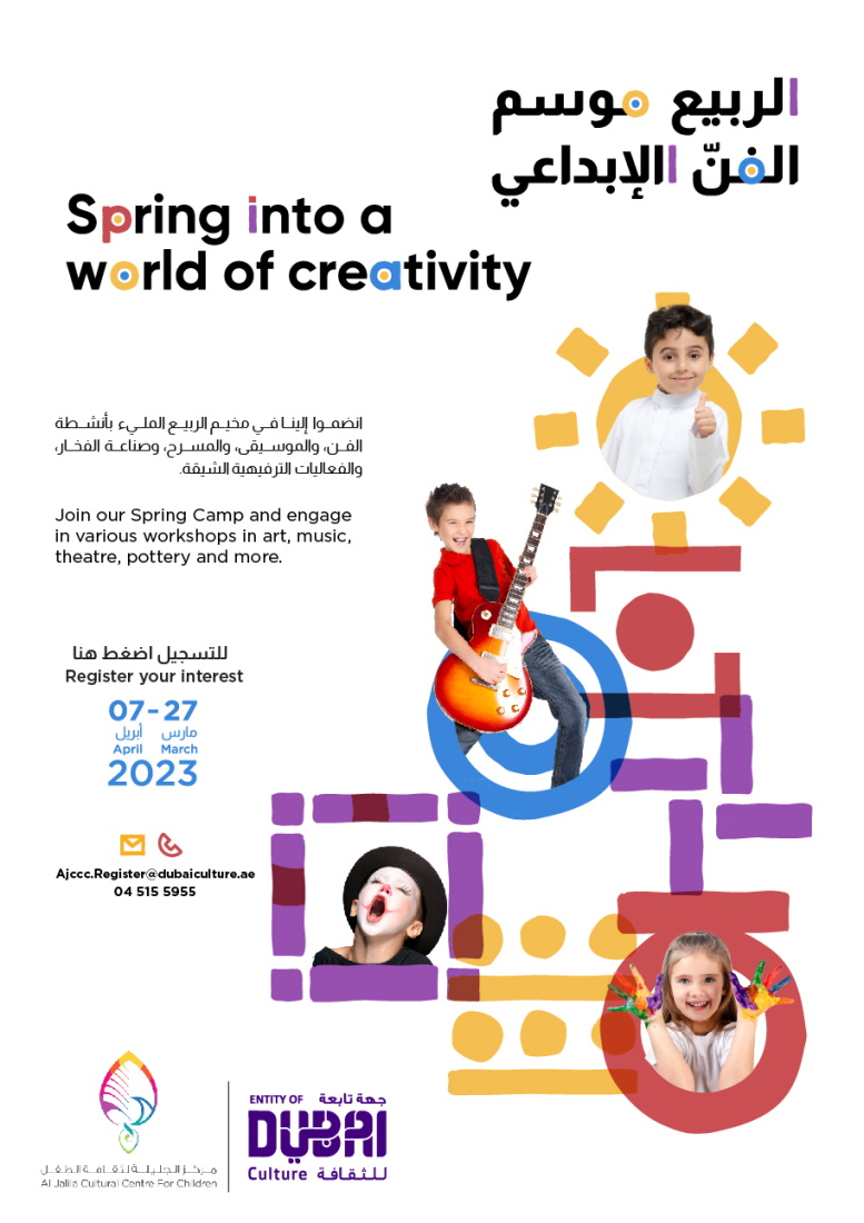 برنامج حافل بالأنشطة الترفيهية وورش العمل التفاعلية، تقدمه هيئة الثقافة والفنون في دبي "دبي للثقافة" لرواد مخيم الربيع الذي يحتضنه مركز الجليلة لثقافة الطفل على مدار أسبوعين، يبدأ الأول من 27 حتى 31 مارس الجاري، بينما يقام الثاني خلال الفترة من 3 حتى 7 إبريل المقبل، وخلالها سيعيش الأطفال تجربة ربيع لا ينسى تُمكنهم من تعزيز مهاراتهم وتوسيع مخيلتهم، عبر التعرف على الفنون المتنوعة وتعلم أصول الحرف اليدوية.