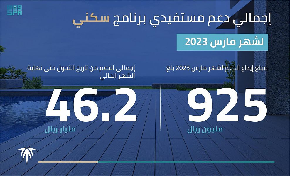أعلن صندوق التنمية العقارية اليوم، إيداع أكثر من 925 مليون ريال في حسابات مستفيدي "سكني" من وزارة الشؤون البلدية والقروية والإسكان و"الصندوق العقاري" لشهر مارس 2023، وذلك في إطار الجهود المتواصلة لدعم المستفيدين، تحقيقًا لأهداف برنامج الإسكان – أحد برامج رؤية السعودية 2030 – لرفع نسبة تملك المواطنين للمساكن إلى 70%. وبين الرئيس التنفيذي للصندوق منصور بن ماضي، أن إجمالي الدعم لشهر مارس الحالي جرى تخصيصه دعماً لأرباح عقود برامج الدعم السكني المتنوعة، مشيراً إلى أن إجمالي ما تم إيداعه في حسابات مستفيدي سكني منذ إعلان برنامج التحّول في يونيو 2017 حتى مارس 2023، تجاوز 46.2 مليار ريال.
