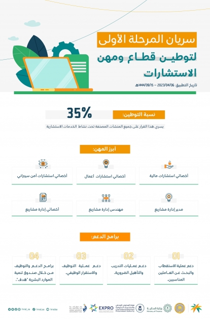 وتضمن توطين قطاع ومهن الاستشارات في مرحلته الأولى توطين مهن الاستشاريين والأخصائيين الذين يمارسون أعمال الاستشارات في القطاع بنسبة 35% حيث من المتوقع أن توفر فرصًا وظيفية للمواطنين والمواطنات.