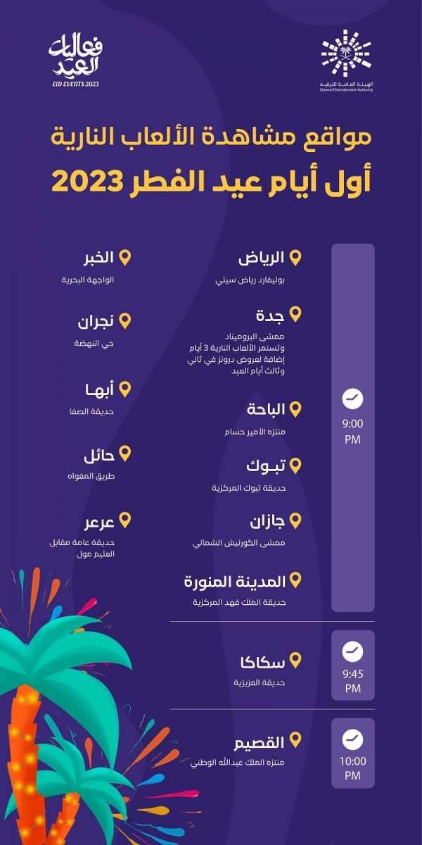 وشملت المناطق التي حددتها الهيئة للاستمتاع بمشاهدة الألعاب النارية عند الساعة التاسعة مساءً، كلًا من مدينة الرياض من خلال منطقة بوليفارد رياض سيتي، ومدينة أبها في حديقة الصفا، ومدينة جدة على ممشى البروميناد، والتي ستستمر عروض الألعاب النارية فيها لمدة 3 أيام، إضافة إلى عروض درونز في ثاني وثالث أيام العيد.