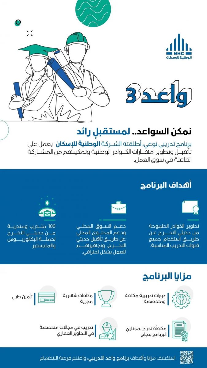 أعلنت الشركة الوطنية للإسكان NHC عن فتح باب التقديم في برنامج "واعد" بنسخته الثالثة لعام 2023م، الذي يستهدف تدريب 100 متدرب من حديثي التخرج لحملة البكالوريوس والماجستير.