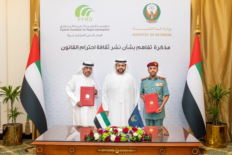 شهد سمو الشيخ محمد بن حمد الشرقي ولي عهد الفجيرة، في قصر الرميلة، توقيع مذكرة تفاهم بين وزارة الداخلية، ومؤسسة الفجيرة لتنمية المناطق، بهدف ترسيخ ثقافة احترام القانون بين الأفراد، ونشر الوعي بالجانب القانوني بين مختلف شرائح المجتمع في الإمارة.