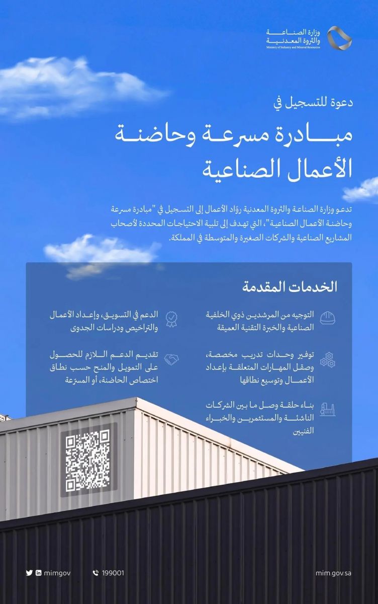 العميقة، وتوفير وحدات تدريب مخصصة، وصقل المهارات المتعلقة بإعداد الأعمال وتوسيع نطاقها، وبناء حلقة وصل ما بين الشركات الناشئة والمستثمرين والخبراء الفنيين، وتقديم الدعم في التسويق، وإعداد الأعمال والتراخيص ودراسات الجدوى، وتقديم الدعم اللازم للحصول على التمويل والمنح حسب نطاق اختصاص الحاضنة، أو المسرّعة، مبينًا أن التسجيل في "مبادرة مسرعة وحاضنة الأعمال الصناعية" من خلال الرابط التالي: https://survey.mim.gov.sa/Survey/JtCq8d1rrgU/.
