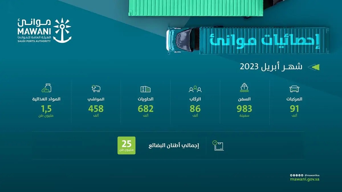 أعلنت الهيئة العامة للموانئ "موانئ" عن تحقيق موانئها ارتفاعاً في أعداد حاويات المُناولة خلال شهر أبريل لعام 2023 بنسبة 13.34% لتصل إلى 681.663 حاوية قياسية مقارنة بـ601.429 حاوية قياسية في ذات الشهر من عام 2022م، وذلك نتيجة للتطور الملحوظ في الأداء التشغيلي للموانئ.