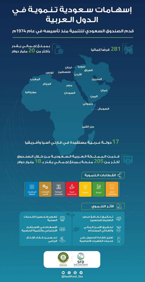 وأسهمت المملكة منذ عام 1975م من خلال الصندوق السعودي للتنمية، في تعزيز ركائز التنمية المستدامة في نطاقاتها المختلفة وأشكالها المتعددة؛ويأتي ذلك اهتمامًا من حكومة المملكة في دعم وتعزيز العلاقات الوثيقة بين الدول العربية، إذ قدَّم الصندوق السعودي للتنمية أكثر من 281 قرضًا مُيسَّرًا تنمويًّا لتنفيذ مشاريع وبرامج إنمائية واقتصادية بمبلغ إجمالي يُقدَّر بـأكثر من 20 مليار دولار في 17 دولة عربية في كل من أفريقيا وآسيا، شملت المشروعات جمهورية مصر العربية، جمهورية السودان، الجمهورية التونسية، جمهورية القُمر المتحدة، جمهورية جيبوتي، المملكة المغربية، الجمهورية الجزائرية الديمقراطية الشعبية، جمهورية الصومال الفيدرالية، الجمهورية الإسلامية الموريتانية، مملكة البحرين، سلطنة عُمان، المملكة الأردنية الهاشمية، الجمهورية العربية السورية، الجمهورية اليمنية، الجمهورية العراقية، الجمهورية اللبنانية، فلسطين،وقد تضمَّنت تلك المشروعات مختلف القطاعات التنموية؛ منها الصحة والتعليم والنقل والمواصلات والزراعة والبنية التحتية والموانئ والطاقة.