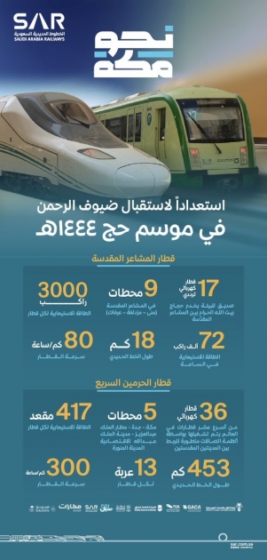 أعلنت الخطوط الحديدية السعودية " سار"، عن جاهزية قطار "الحرمين السريع" و قطار "المشاعر المقدسة" لنقل ضيوف الرحمن خلال موسم حج هذا العام 1444هـ، بكل سهولة ويسر؛ حيث تم تسخير كافة الإمكانيات للإسهام في تحسين تجربة الحاج عبر تنقله السلس في قطار الحرمين السريع الذي يعتبر أحد أسرع عشرة قطارات في العالم، حيث يربط الحرمين الشريفين ببعضهما مرورًا بمدينة الملك عبدالله الاقتصادية ومدينة جدة.