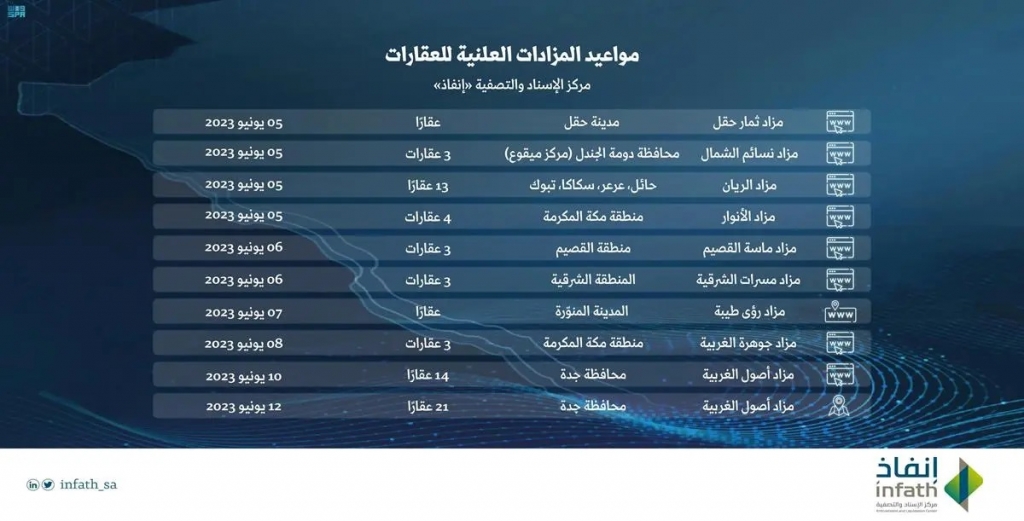 وتبدأ المزادات بـ عقارٍ في محافظة حقل في مزاد ثمار حقل الإلكتروني، و 3 عقارات بمحافظة دومة الجندل في مزاد نسائم الشمال الإلكتروني، و13 عقاراً في كل من حائل، عرعر، تبوك، سكاكا، من خلال مزاد الريان الإلكتروني، و 7 عقارات في منطقة مكة المكرمة من خلال مزادين تبدأ بمزاد الأنوار وجوهرة الغربية الإلكتروني، و3 عقارات بمنطقة القصيم في مزاد ماسة القصيم الإلكتروني، و3 عقارات بمنطقة الشرقية في مزاد مسرّات الشرقية الإلكتروني، وعقارٍاً بالمدينة المنورة من خلال مزاد رؤى طيبة الإلكتروني، وأخيراً 35 عقاراً في محافظة جدة في مزاد الأصول الغربية الحضوري والإلكتروني.