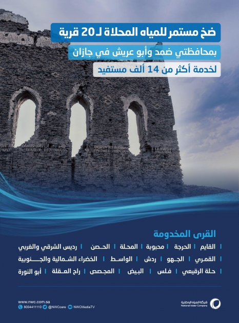 وأضافت الشركة أن كميات المياه المحلاة التي توزعها حالياً في لــ 20 قرية في محافظتي ضمد وأبو عريش بجازان أكثر من (10,000) متر مكعب يوميًا، كما يبلغ عدد المستفيدين أكثر من (14,000) ألف مستفيد، و نوهت الشركة على ضرورة قيام العملاء بالتأكد من سلامة خزانات المياه الأرضية وشبكة التوزيع داخل عقاراتهم وخلوها من التسربات التي تؤيد إلى ارتفاع الاستهلاك.