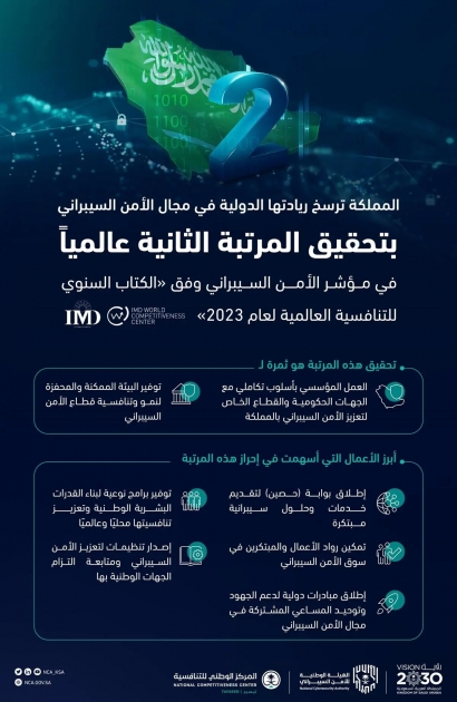 حققت المملكة المرتبة الثانية عالمياً في مؤشر الأمن السيبراني، وذلك ضمن تقرير الكتاب السنوي للتنافسية العالمية لعام 2023، الصادر عن مركز التنافسية العالمي التابع للمعهد الدولي للتنمية الإدارية في سويسرا IMD، والذي يهدف إلى تحليل وترتيب قدرة الدول على إيجاد بيئة داعمة ومحفزة للتنافسية والمحافظة عليها وتطويرها.