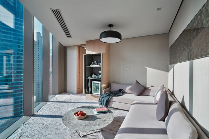 حيث تتسم غرفه وأجنحته بعصرية أثاثها، وهدوء طابعها، وحلاوة إطلالتها، وتوفيرها لكافة ما يحتاجه النزلاء في أمكنة إقاماتهم، ما يشعرهم برغبة عارمة بعدم المغادرة، علاوةً على اتساع مساحتها والاهتمام العالي جداً بنظافتها وترتيبها وفق أحدث الأساليب العصرية في علم الضيافة، ناهيك عن سلاسة الدخول بالسيارة إلى بوابة الفندق، القريب من المعالم السياحية في المدينة، واحتوائه على أهم مراكز اللياقة في البلاد، ولا يمكن أن ننسى الشاطئ البحري المخصص لخلق تجربة سياحة مميزة في فصل الصيف الحار جنباً إلى جنب مع حمام السباحة الواسع والمرفق بإمكانية تقديم الشيشة والمأكولات والمشروبات المناسبة لهذا الفصل من السنة