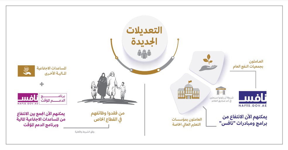 وأكد سعادة غنام المزروعي أمين عام مجلس تنافسية الكوادر الإماراتية أنه بموجب هذا القرار، فإنه يحق الآن لأي مواطن يفقد وظيفته في القطاع الخاص بسبب خارج عن إرادته وليس له مصدر دخل، وفي الوقت نفسه ينتفع من أي برنامج مساعدات اجتماعية مالية، سواء له أو لزوجه أو أبنائه من الجهات الاتحادية أو المحلية؛ يحق له الاستفادة من مساعدة برنامج الدعم المؤقت وفقا للشروط والضوابط المنصوص عليها في هذا الشأن.
