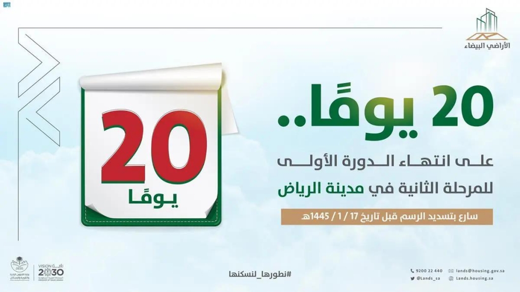 أكد برنامج رسوم الأراضي البيضاء قرب انتهاء مهلة سداد فواتير الدورة الأولى للمرحلة الثانية في مدينة الرياض، داعياً الملاك إلى المبادرة بسداد فواتير الرسوم الصادرة على أراضيهم قبل انتهاء المهلة بتاريخ 2023/8/4م.