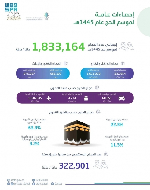 أعلنت الهيئة العامة للإحصاء اليوم أن إجمالي أعداد الحجاج هذا العام 1445هـ بلغ (1,833,164) حاجًّا، منهم (1,611,310) حجاج قدموا من خارج المملكة عبر المنافذ المختلفة، فيما بلغ عدد حجاج الداخل (221,854) حاجًّا من المواطنين والمقيمين.