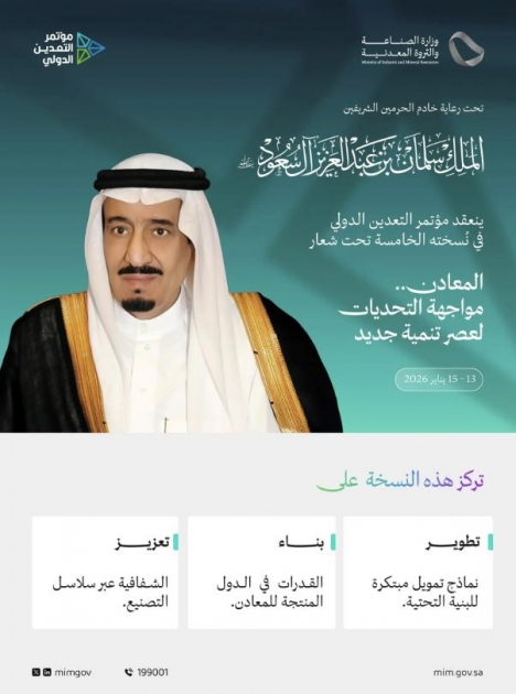 تحت رعاية خادم الحرمين الشريفين الملك سلمان بن عبدالعزيز آل سعود -حفظه الله-، تُعقد النسخة الخامسة من مؤتمر التعدين الدولي خلال الفترة من 13 إلى 15 يناير 2026 بمدينة الرياض، تحت شعار "المعادن.. مواجهة التحديات لعصر تنمية جديد"، وذلك بتنظيمٍ من وزارة الصناعة والثروة المعدنية.