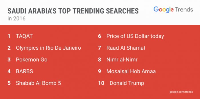 وفيما يلي نتائج البحث الأكثر رواجاً في المملكة العربية السعودية على محرك بحث Google لعام ٢٠١٦ :