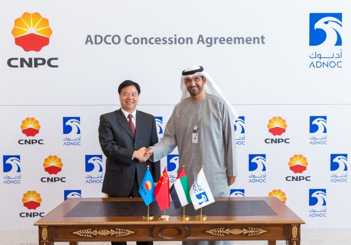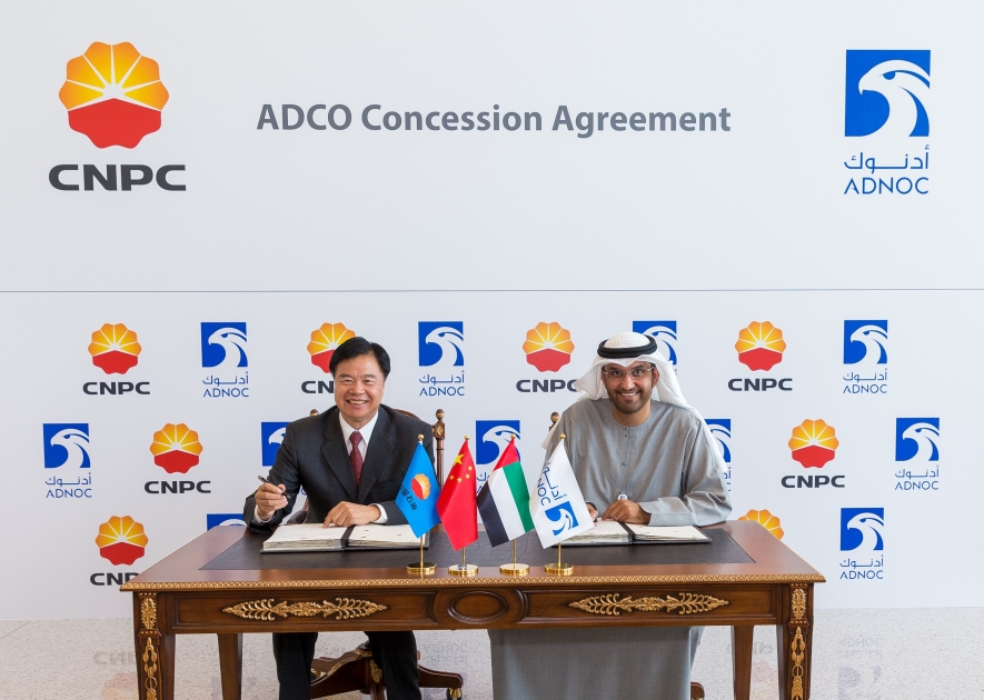 وقعت شركة بترول أبوظبي الوطنية "أدنوك" اليوم اتفاقية امتياز مع الشركة الوطنية الصينية للبترول بنسبة 8% في حقول أبوظبي النفطية البرية التي تديرها شركة أبوظبي للعمليات البترولية البرية "أدكو"، مقابل رسم مشاركة يبلغ 6.5 مليار درهم (1.776) مليار دولار.