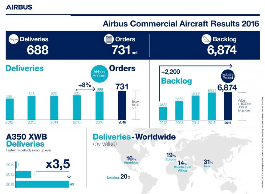 أعلنت شركة إيرباص عن تسجيل رقم قياسي في التسليمات لعام 2016 والذي هو في تزايد مستمر لعامه الــ 14 على التوالي. حيث سلمت الشركة في العام المنصرم ـ 688 طائرة لـ 82 عميل حول العالم, وتأتي هذه التسليمات بزيادة قدرها 8% عن عام 2015 والبالغ عددها 635 طائرة.
