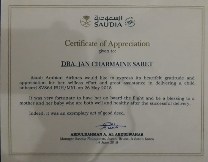 في حدث سار وفريد من نوعه الطبيبة جان ساريت، استشارية طب النساء وولادة في مستشفى آستر سند في الرياض، تقوم بعميلة ولادة ناجحة في الجو لاحدى الراكبات على متن الخطوط الجوية السعودية المتجهة إلى الفلبين .