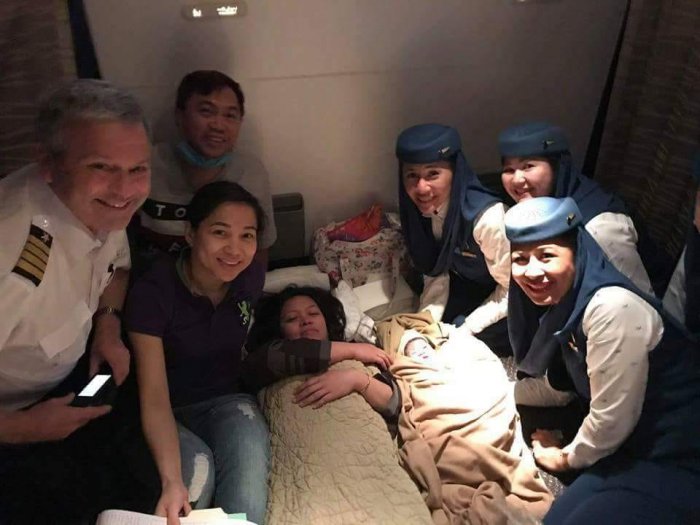 واثناء الرحلة بدأت تشعر الأم بآلام المخاض على متن الطائرة التي تحلق على علو شاهق في طريقها إلى الفلبين وكان الطيار غير قادر على إجراء هبوط إضطراري، حيث قام طاقم العمل بطلب المساعدة من الركاب ومن حسن الحظ أن الطبيبة جان ساريت كان على متن الطائرة لتقديم يد العون.
