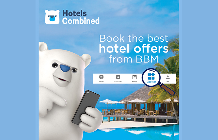 ونجد هوتيلزكومبايند على شكل أيقونة داخل قائمة إستكشف Discover بتطبيق "بي بي أم ماسنجر" BBM Messenger تتضمن المحتوى والخدمات. وتشكّل قائمة إستكشف بتطبيق بي بي أم مساحة ذات قيمة عالية داخل التطبيق، وهي مصمّمة بحيث تعطي قدراً متميزاً من الفعالية وإمكانية الوصول إليها بسهولة، كما إنها توفر في نفس الوقت للمشتركين إمكانية التمتع بميزة الدردشة الإجتماعية.