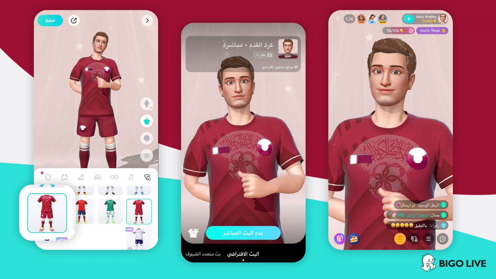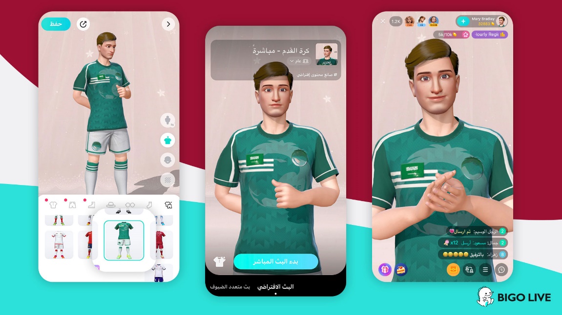 في إطار ميزة "فيرتشوال لايف" "Virtual Live" المتاحة على المنصة، أضافت "بيجو لايف" Bigo Liveملابس رياضية جديدة خاصة بشخصيات الأفاتار الافتراضية، ومن ضمنها قمصان كرة القدم من الإمارات العربية المتحدة والمملكة العربية السعودية والمغرب وقطر. ومن خلال الإصدار الأحدث من نوعه للمنصة، بإمكان المستخدمين اختيار شخصيات الأفاتار ثلاثية الأبعاد الخاصة بهم من تشكيلة الأزياء المتوفرة، إلى جانب خلفيتين جديدتين حصريتين لكرة القدم لاستخدامها أثناء البث المباشر من أجل تقديم تجربة متابعة أكثر جاذبية لمشجعي كرة القدم حول العالم.