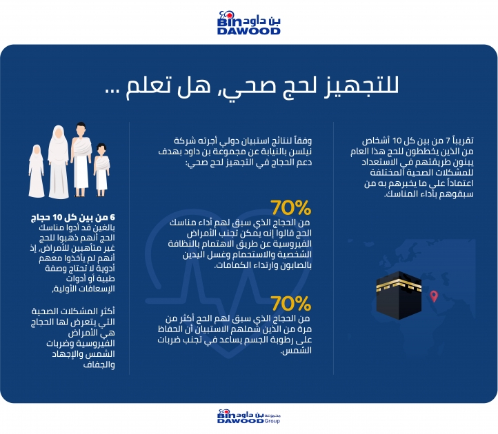 أعلنت متاجر بن داود اليوم – قبل بدء موسم الحج بأيام قليلة – نتائج الاستبيان الدولي الذي أجرته شركة نيلسن بالنيابة عن مجموعة بن داود، والذي تم تصميمه ليكون جزءاً من التزام المجموعة الدائم بزيادة الوعي الصحي بين حجاج بيت الله الحرام.