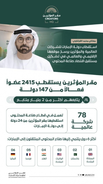 كما نجح مقر المؤثرين في استقطاب 78 شركة عالمية تعمل في هذا القطاع من 24 دولة لتنتقل إلى دولة الإمارات، وجاءت كل من: المملكة المتحدة، وباكستان، والولايات المتحدة، والهند، وفرنسا، وألمانيا، في مقدمة دول صناع المحتوى المنتقلين إلى الإمارات.