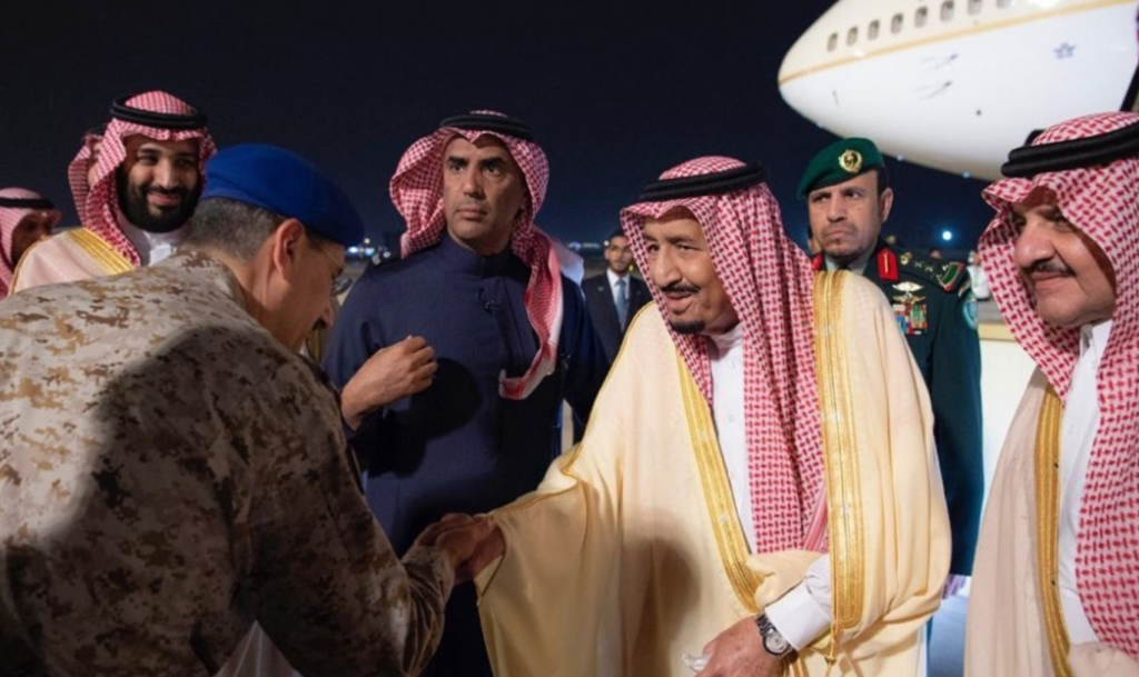 وكان في استقبال خادم الحرمين الشريفين عند سلم الطائرة بمطار قاعدة الملك عبدالعزيز الجوية في الظهران، صاحب السمو الملكي الأمير سعود بن نايف بن عبدالعزيز أمير المنطقة الشرقية، وصاحب السمو الملكي الأمير محمد بن سلمان بن عبدالعزيز ولي العهد نائب رئيس مجلس الوزراء وزير الدفاع.