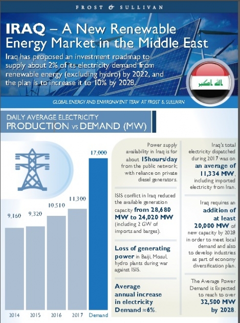وفي إطار تعليقه على الموضوع قال السيّد علي ميرمحمد، كبير المستشارين ومدير تطوير الأعمال لدى "فروست آند سوليفان": "بغرض المضي نحو اقتصاد مستدام، تتطلّب البنية التحتية للطاقة الكهربائية في العراق استثمارات ضخمة في توسيع الطاقة الإنتاجية، وتحسينات في الكفاءة من خلال التحديثات، والطاقة الإنتاجية القائمة على الطاقات المتجددة. وهناك حاجةٌ ملحّة لإصلاح وتطوير خطوط النقل والمحطات الفرعية للحدّ من هدر الطاقة خلال عمليات النقل والتوزيع. ويتطلّب هذا النوع من البرامج التطويرية لقطاع الطاقة الكهربائية في العراق رأس مال يتجاوز 50 مليار دولار أمريكي في الفترة ما بين 2018-2028، ما يمثّل فرصاً هائلة أمام شركات التوريد في هذا القطاع".