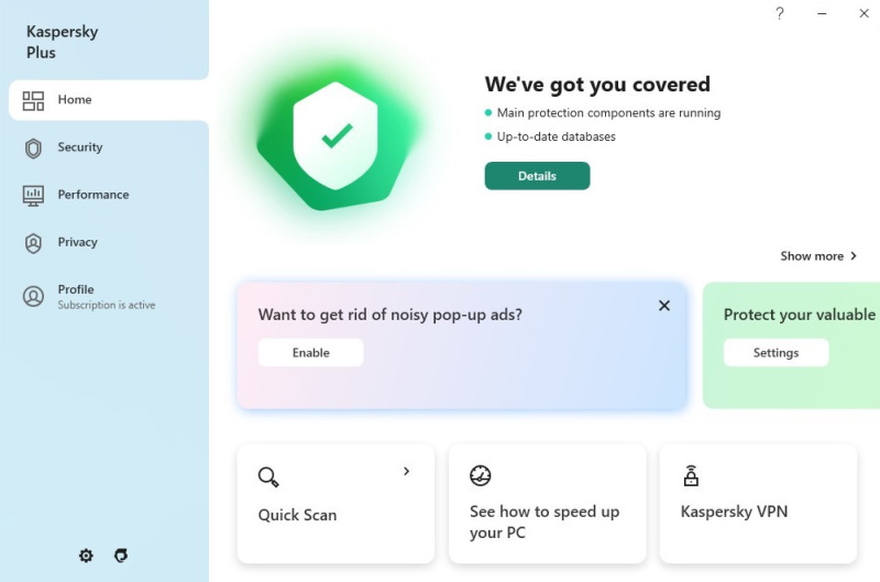 أما باقة Kaspersky Plus تتضمّن قدرات خصوصية أكثر وضوحاً، إذ يحصل المستخدمون المشتركون في هذه الباقة على حق الوصول إلى كل ما هو متاح في باقة Kaspersky Standard المعيارية، بالإضافة إلى اشتراك غير محدود في VPN وفي Premium Password Manager، كما يحصلون على Data Leak Checker، الذي يراقب الإنترنت والويب المظلم ويحذر المستخدمين إذا وجد بياناتهم متسربة مقدماً توصيات بشأن ما يجب فعله إزاء ذلك. كذلك تتضمن الباقة ميزة Password Safety Status، التي تعزز حماية كلمات المرور من خلال التحقق من حالتها الأمنية ومدى تعرّضها للتسريب. ويمكن للمستخدمين ضمن باقة Kaspersky Plus معرفة الأجهزة المتصلة بالشبكة المنزلية، وهي ميزة مفيدة لأصحاب المنازل الذكية.