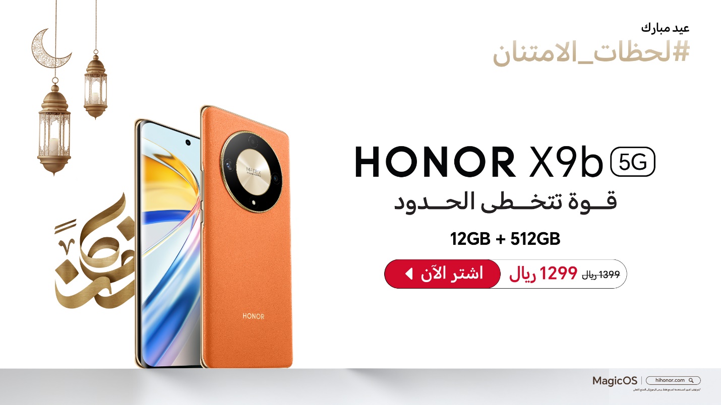 تعبيراً عن الفرحة بقدوم عيد الفطر والذي يعد رمز للتجمع والمحبة بين الاهل والأصدقاء، تعبر علامة HONOR عن امتنانها للملايين من المستخدمين من خلال تقديم عروض رائعة وخصومات لا مثيل لها. ابتداءً من 25 مارس إلى 15 أبريل، يمكن للمستهلكين الاستمتاع بخصم يصل إلى 1100 ريال سعودي على منتجات HONOR، مما يجعلها فرصة رائعة للمستخدمين لإهداء أنفسهم أو أحبائهم بأحدث وأفضل التقنيات الذكية وترقية محفظتهم من الأجهزة الذكية.