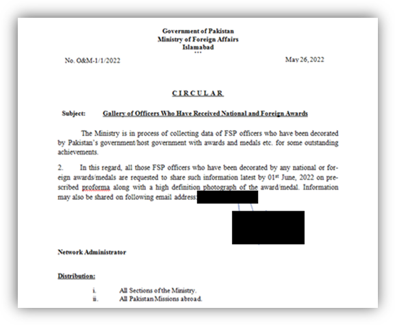 وأطلق على المستند اسم "مستند معرض الضباط الذين حصلوا على جوائز وطنية وأجنبية". ويظهر كنشرة معتمدة تطلب معلومات حول الضباط الذين تم تكريمهم من قبل الحكومة الباكستانية. وتم نشر أول وصف لثغرة Follina في 29 مايو 2022، ويبدو أن هذا المستند قد تم تعديله في 1 يونيو، أي بعد يومين من النشر، واكتشف لأول مرة في 2 يونيو.