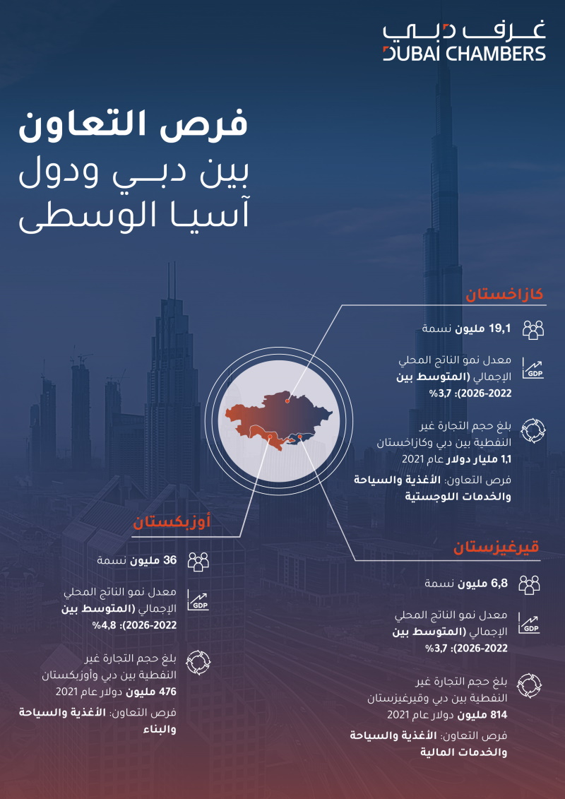 وتماشياً مع الأولوية الاستراتيجية لغرف دبي والمتمثلة في دعم توسع الشركات الأعضاء في الأسواق الخارجية، ركّزت أولى فعاليات مبادرة "فرص الأعمال تحت المجهر" على آفاق الاستثمار والتجارة المتاحة والمجزية بين دبي وكل من كازاخستان وقرغيزستان وأوزبكستان.