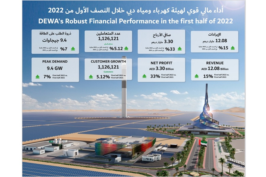 أعلنت هيئة كهرباء ومياه دبي ش.م.ع، المزود الحصري لخدمات الكهرباء والمياه في دبي، والمدرجة في سوق دبي المالي تحت الرمز (DEWA) والرقم الدولي الموحد للأوراق المالية (ISIN: AED001801011)، اليوم عن نتائجها المالية القوية للربع الثاني من عام 2022، مسجلة إيرادات ربع سنوية بلغت 7.01 مليار درهم، و 2.61 مليار درهم صافي أرباح. وفي النصف الأول من عام 2022، بلغت إيرادات هيئة كهرباء ومياه دبي 12.08 مليار درهم، ووصل صافي الأرباح إلى 3.30 مليار درهم.
