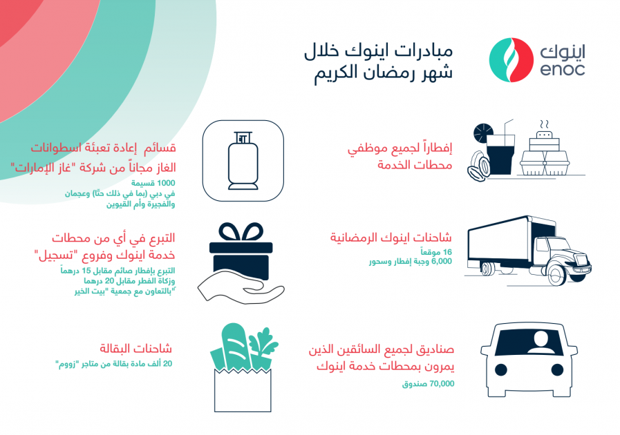 ومن بين المبادرات التي تعتزم مجموعة اينوك تنفيذها خلال الشهر الكريم شراكة مع جمعية الإحسان الخيرية لتوزيع 500 ألف وجبة إفطار على السائقين قبل موعد صلاة المغرب، وذلك لتشجيع القيادة الآمنة وتجنيب الصائمين القيادة بسرعة للوصول في موعد الإفطار، ومبادرة بالتعاون مع جمعية "بيت الخير"، تمكّن الأفراد التبرع بإفطار صائم مقابل 15 درهماً وزكاة الفطر مقابل 20 درهماً، في أي من محطات خدمة اينوك وفروع "تسجيل".