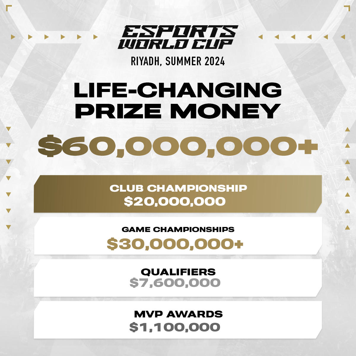 أعلنت مؤسسة كأس العالم للرياضات الإلكترونية “EWCF” Esports World Cup Foundation، عن قيمة مجموع الجوائز المالية المقدمة خلال النسخة الأولى من "كأس العالم للرياضات الإلكترونية" والمُقامة بمدينة الرياض. حيث سيتم تقديم 60 مليون دولار، وهو ما يُعد الجائزة الأكبر في تاريخ قطاع الألعاب والرياضات الإلكترونية والتي كانت في السابق لموسم الجيمرز: أرض الأبطال بمجموع جوائز بلغ 45 مليون دولار.