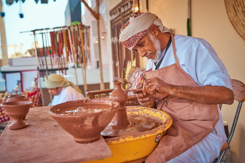 كما تضم القرية التراثية العديد من الحرف المتنوعة بيد حرفيين متخصصين في صناعة الفخار والخناجر والخياطة في ثوبها التراثي القديم لتعريف الجمهور بموروث الآباء والأجداد.