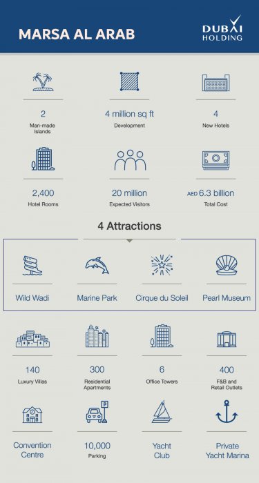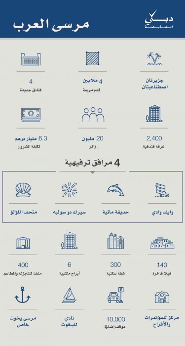 ويضيف مشروع "مرسى العرب"، الذي يغطي مساحة 4 ملايين قدم مربعة ويتكون من جزيرتين على طرفي فندق "برج العرب جميرا"، إحداهما للترفيه والسياحة العائلية والأخرى لمنتجع حصري فاخر، 2.2 كيلو متراً إلى الواجهة البحرية للإمارة كما يُعد إضافةً جديدةً إلى رصيد دبي الحافل بالإنجازات السياحية على أرفع المستويات العالمية.