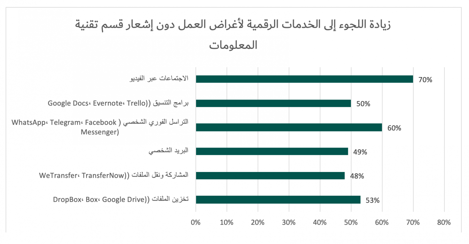 ويمكن أن يؤدي التنزيل غير المقصود لمحتوى تخريبي من رسائل البريد الإلكتروني هذه إلى إصابة الأجهزة وتعريض بيانات الأعمال للخطر. وفي المقابل ارتفع عدد الموظفين الذين يلجأون إلى استخدام تطبيقات وخدمات على الإنترنت للعمل لم توافق عليها أو تعتمدها أقسام تقنية المعلومات في شركاتهم، فيما يُعرف بتقنية المعلومات الظلّية، والتي تشمل تطبيقات الاجتماعات عبر الفيديو (70%) وبرمجيات المراسلة الفورية (60%) وخدمات تخزين الملفات (53%).