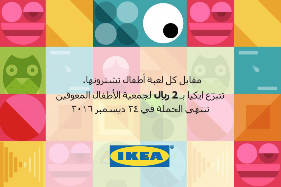 ومن خلال هذه الحملة ستقوم ايكيا المملكة العربية السعودية بالتبرع بريالين من كل لعبة طرية يتم بيعها خلال شهري نوفمبر وديسمبر 2016، وذلك لصالح تعليم أطفال جمعية الأطفال المعوقين. وتهدف الحملة إلى توفير التعليم والتطوير والتعلم فضلا عن اللعب للاطفال ذوي الإحتياجات الخاصة. وكلما زاد عدد الألعاب التي سيتم بيعها سيتمكن عدد كبير من الأطفال ذوي الإحتياجات الخاصة من الحصول على فرص تعليمية جيدة تمنحهم الأمل من أجل أن يعيشوا حياة أكثر ازدهارا.