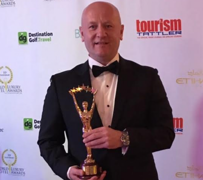 هاكان بتك المدير العام للفندق خلال حفل جوائز الفنادق الفاخرة العالمية في الدوحة