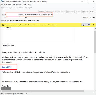 اعرف عميلك (KYC): ينتحل مجرمو الإنترنت صفة بنوك بارزة، ويطلبو من الأشخاص إكمال عملية التحقق (اعرف عميلك)، وهي عملية تطلبها البنوك من عملائها لتأكيد امتثالهم للوائح المالية لتفادي تعليق معاملاتهم المصرفية. ويستغل المجرمون هنا جانب الخوف البشري من خلال إبراز بعض الكلمات، مثل "عاجل" في البريد الإلكتروني للتلاعب بضحاياهم. ويبدو تنسيق البريد الإلكتروني وتصميمه ورابط "أعرف عميلك" KYC وكأنها أصلية، كوسيلة خداع بصري للمستهدفين.