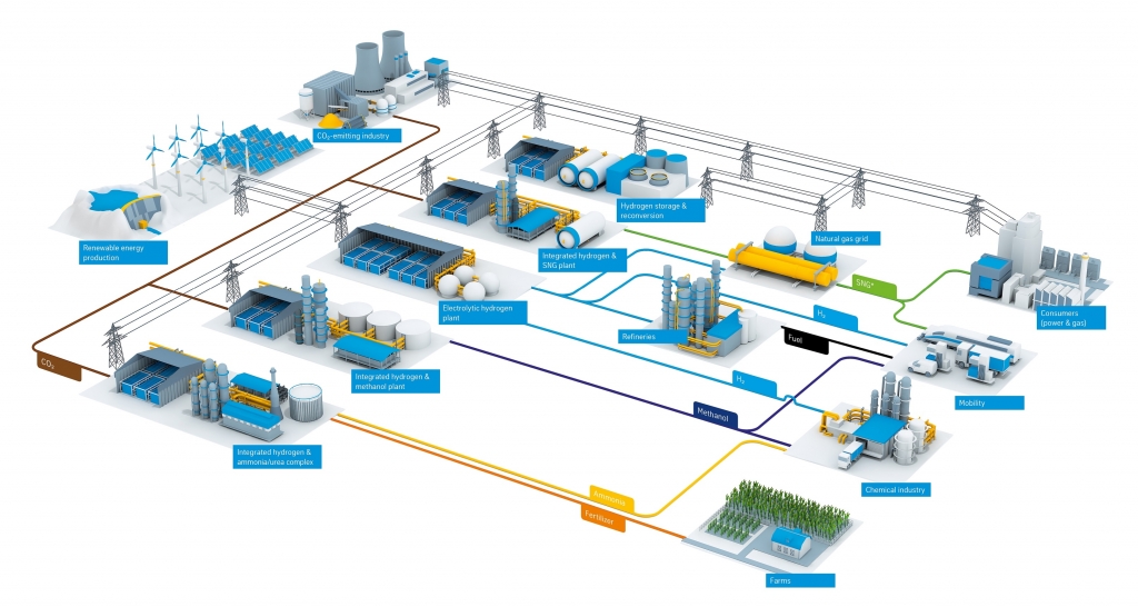 لا يعد عنصر الهيدروجين حاملاً للطاقة النظيفة فحسب، بل يستخدم لتخزين الطاقة على المدى الطويل في شبكة الغاز، أو للوقود النظيف، على سبيل المثال: لنقل خلايا الوقود. فعندما يتم استخلاص الهيدروجين باستخدام مصادر الطاقة المتجددة يمكننا إنتاج مواد كيميائية رئيسية مستدامة. وأبرز مثال على ذلك، الأمونيا المستخرجة من "مصادر خضراء": ففي ظل وجود تكنولوجيا تحليل المياه الكهربائية وعملية إنتاج الأمونيا ذات المستوى العالمي، يمكن لشركة "تيسين كروب" إنشاء مصانع متكاملة يمكن أن تنتج الأمونيا من الماء أو الهواء أو أشعة الشمس أو الرياح. ويمكن معالجة الأمونيا لتتحول إلى أسمدة.