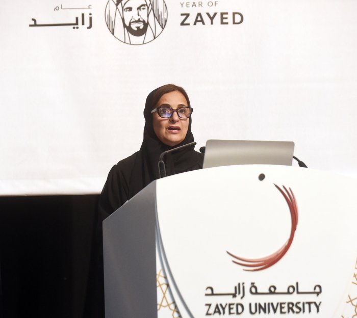 وقالت معاليها في مستهل كلمتها: "يشرفني أن أنتهز مناسبة ملتقانا اليوم لأتوجّهَ بعميقِ الشكرِ والتقدير للدّعمِ القويّ والمتواصلِ الذي تُوليه قيادتُنا الرشيدةُ لجامعة زايد، وعلى رأسِها صاحبُ السمو الشيخ خليفة بن زايد آل نهيان، رئيسُ الدولة، حفظه الله.