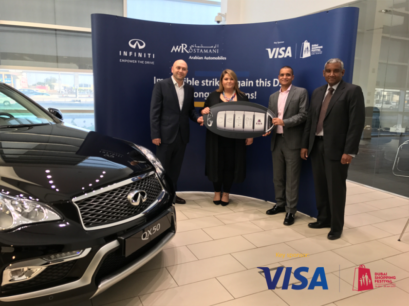 أعلنت "فيزا"، الشركة العالمية لتقنيات الدفع المدرجة في بورصة نيويورك تحت الرمز (NYSE:V) وشريك المدفوعات الرسمي لمهرجان دبي للتسوق 2017، عن فوز اثنين من سعداء الحظ حاملي بطاقات فيزا، بسيارتي "إنفينيتي كيو إكس 50" الكروس اوفر الفاخرة الرياضية متعددة الاستخدامات ضمن حملتها الترويجية "عروض تتجاوز المستحيل" في مهرجان دبي للتسوق 2017.
