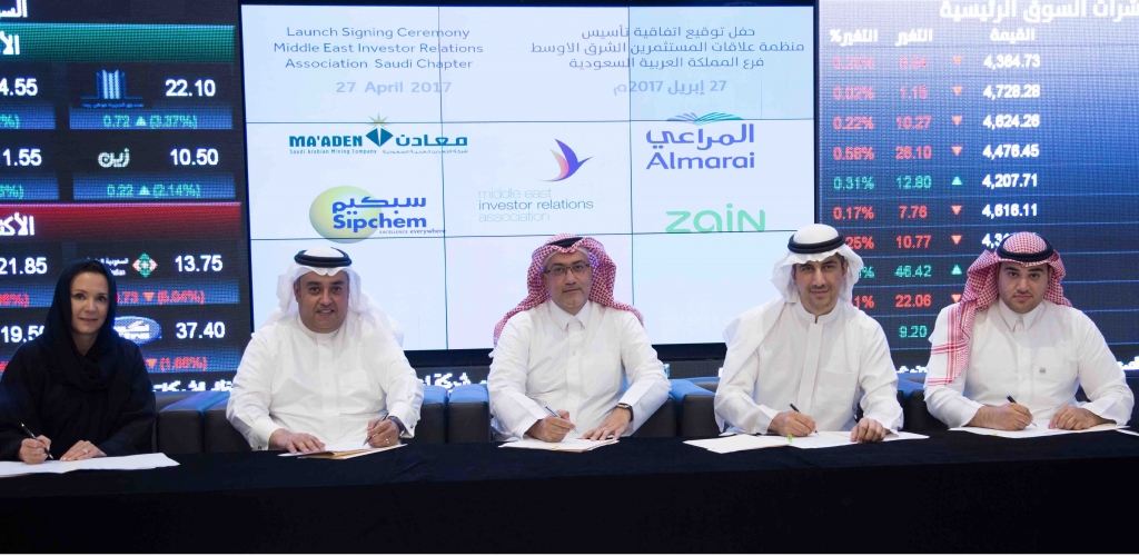 وقد حظي اعلان تدشين فرع الجمعية بحضور المؤسسين إكرام الحقي مدير إدارة علاقات المستثمرين في شركة المراعي، ووليد بن خالد الحكيم مدير إدارة علاقات المستثمرين في شركة معادن، وفيصل بن محمد المدلج مدير إدارة علاقات المستثمرين في شركة سبكيم، وريان القرعاوي مدير إدارة علاقات المستثمرين في شركة زين السعودية والسيدة /سامانثا بارتيل الخلف ممثلة الجمعية في الشرق الأوسط، بصفتهم الأعضاء المؤسسين لفرع المملكة العربية السعودية بجمعية علاقات المستثمرين الشرق الأوسط.