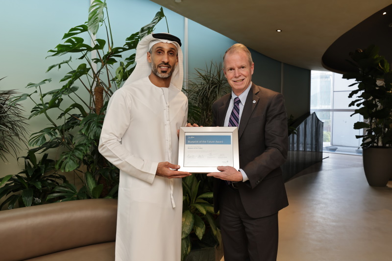 وسلّم السيد "جورج أوليفر"، رئيس مجلس الإدارة العالمي الجائزة إلى سعادة خلفان بلهول، المدير التنفيذي لمؤسسة دبي للمستقبل.