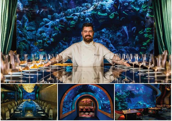 لا يقتصر تعاون ’المحارة‘ وناثان آوتلو على إعداد الأطباق اللذيذة فحسب، بل يشمل أيضاً الجوانب المتعلّقة بالتصميم لإتاحة حيّزٍ يجعل الضيوف يشعرون وكأنهم يزورون عالماً ساحراً في أعماق البحار؛ حيث يمتد الحوض المائي المدهش من الأرضية إلى السقف ليستأثر بالمشهد ويبثّ الاسترخاء والسرور في عيون الناظرين مع ما يضمه من شعبٍ مرجانية صغيرة وما يزيد عن 30 نوعاً من الأسماك الغريبة ذات الألوان الساحرة.