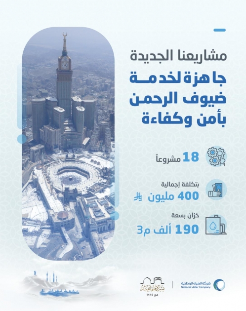 أعلنت شركة المياه الوطنية، ممثلة بالقطاع الغربي اكتمال تنفيذ (18) مشروعًا رأسماليًا وتشغيليًا في مدينة مكة المكرمة والمشاعر المقدسة بكُلفة مالية قاربت (400) مليون ريال، وذلك ضمن خططها الرامية إلى تعزيز البنية التحتية في قطاعي المياه والخدمات البيئية، وزيادة نسب التغطية لخدمة السكان والزوار وضيوف الرحمن خلال موسم حج ١٤٤٦هـ والأعوام القادمة.