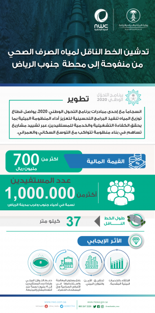 دشنت شركة المياه الوطنية أحد أهم مشاريعها الاستراتيجية التي تعنى بالنهوض بالخدمات البيئية وتحقيق التوازن البيئي في مدينة الرياض، والذي يتمثل بمشروع الخط الناقل لمياه الصرف الصحي من محطة المعالجة بمنفوحة إلى محطة المعالجة الجديدة في جنوب الرياض.